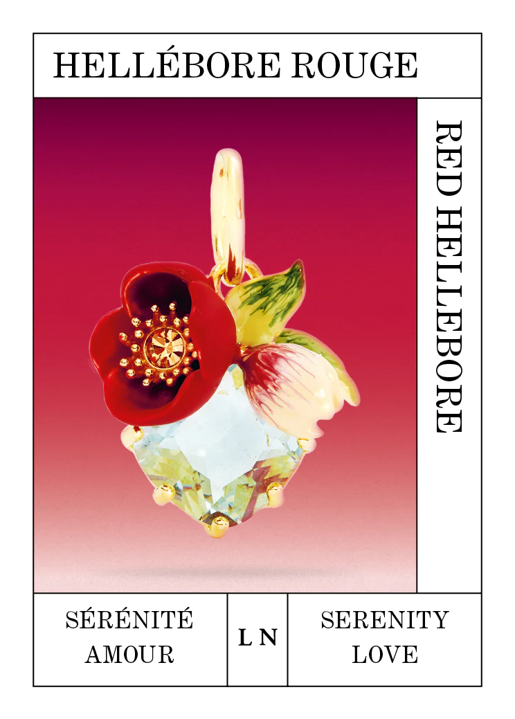 Pendentif fleurs et pierre en verre facetté. Fleurs peintes à la main, dont une héllébore rouge bordeaux, et pierre taillée bleue. À accrocher, seul ou en accumulation, à l’un de nos supports vendus séparément. Créez un bijou unique et portez vos symboles comme des porte-bonheurs, pour une composition à votre image.