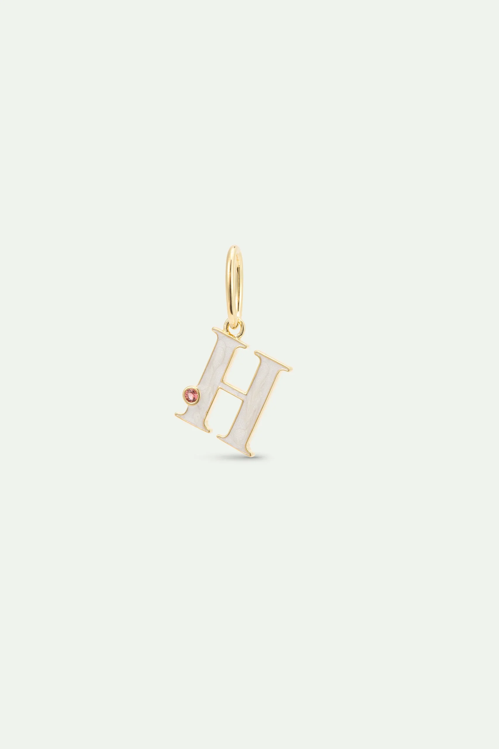 Pendentif lettre H blanc peinte à la main et ornée d’un oxyde de zirconium rouge.
