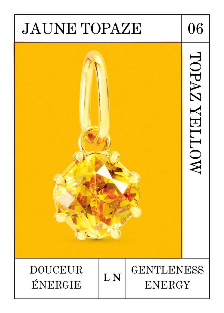 Pendentif Jaune Topaze, pierre en verre taillé sertie en laiton doré à l’or fin. Il porte en lui toute la clarté des jours les plus vifs, de ces solstices vibrants d’une énergie qui semble intarissable. Topaze proviendrait d’un mot sanskrit signifiant chaleur ou feu.