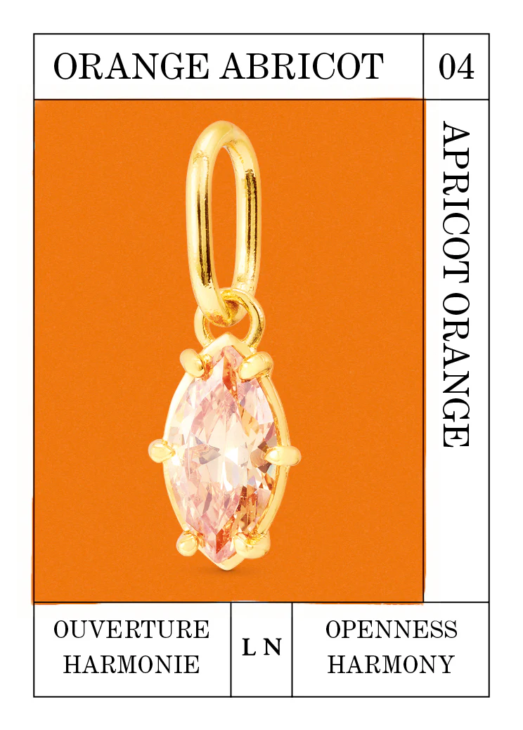 Pendentif Orange Abricot, pierre en verre taille ovale sertie en laiton doré à l’or fin. Ce bijou renferme l’association symbolique de l’agrume et du sucre charnu. C’est la couleur du renouveau, de l’ouverture à tout ce qui est autre.