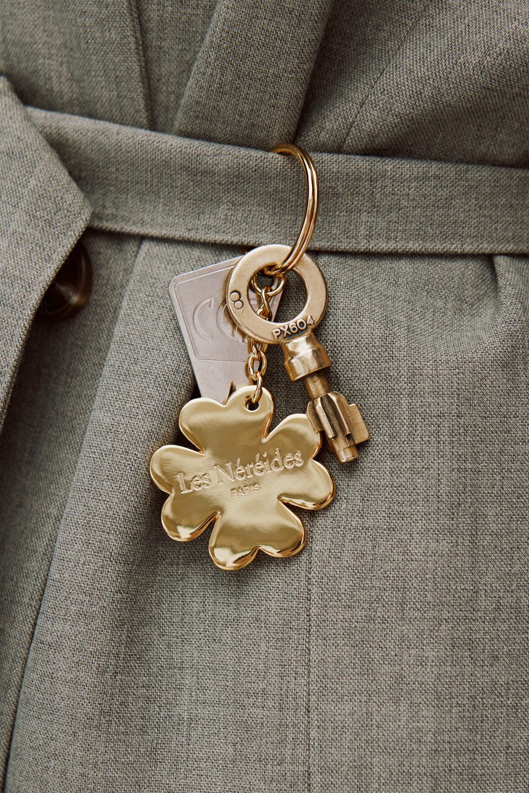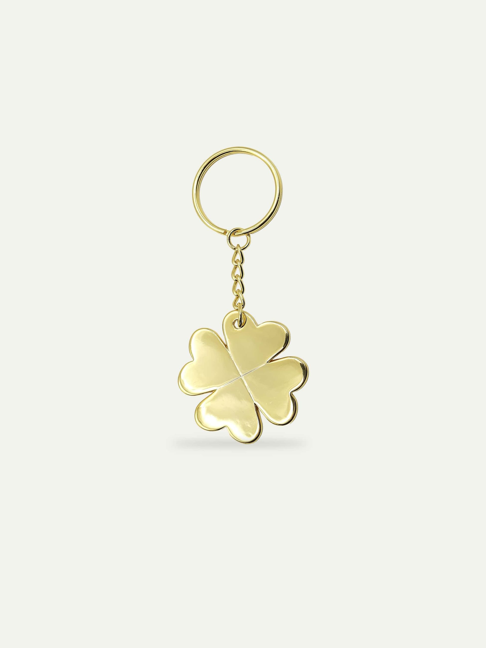 Porte clés trèfle à quatre feuilles en métal doré avec anneau. Vous pouvez également l’utiliser comme bijou de sac.