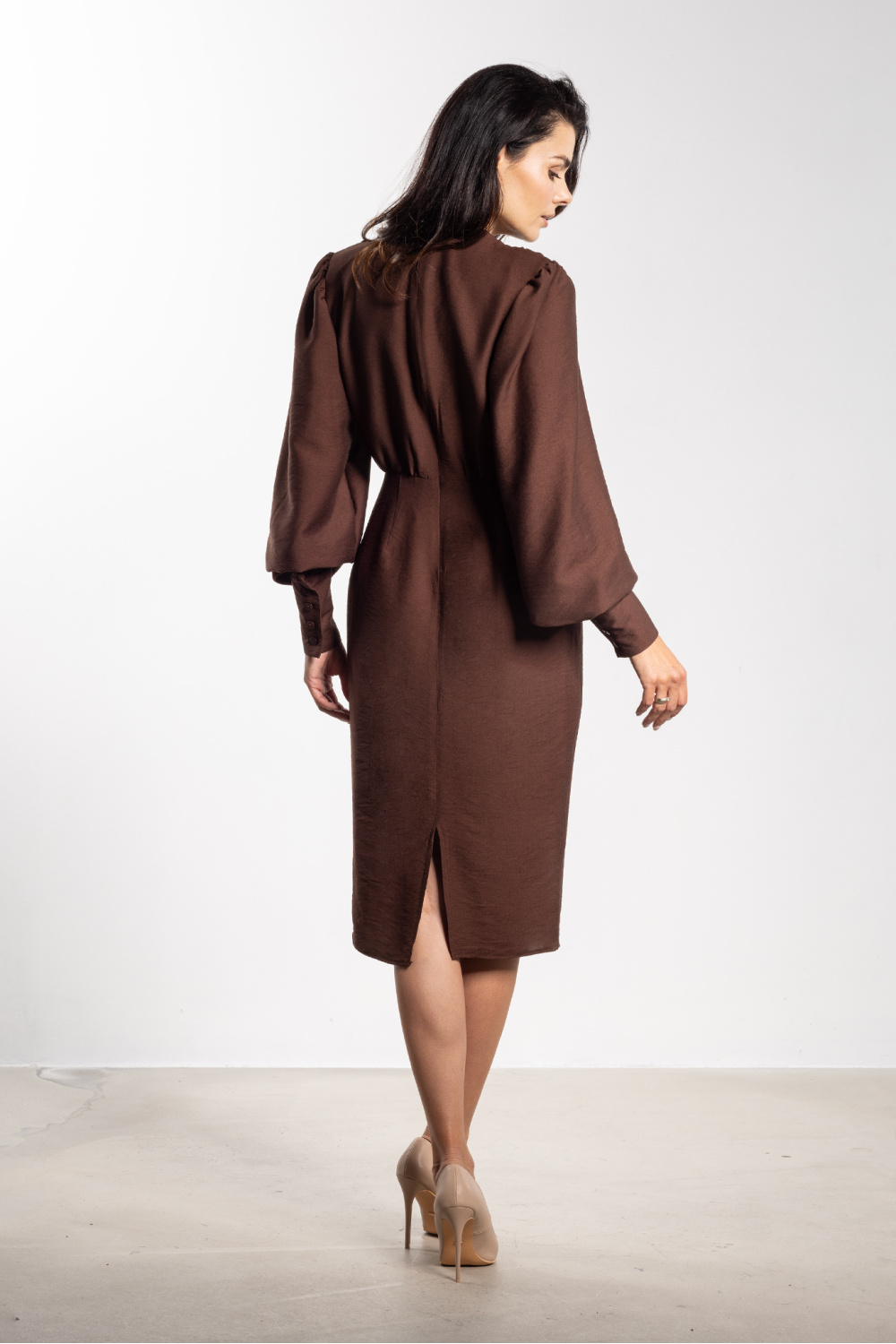 La robe midi ajustée est un choix parfait pour des occasions spéciales. Le profond décolleté en V met en valeur le cou et souligne subtilement la poitrine, donnant à la tenue un caractère féminin. Les plis à la taille affinent la silhouette, tandis que le bas crayon garantit une ligne classique. Les longues manches bouffantes avec de larges poignets ajoutent légèreté et élégance, tandis que la longueur au-dessus du genou allie classe et féminité.