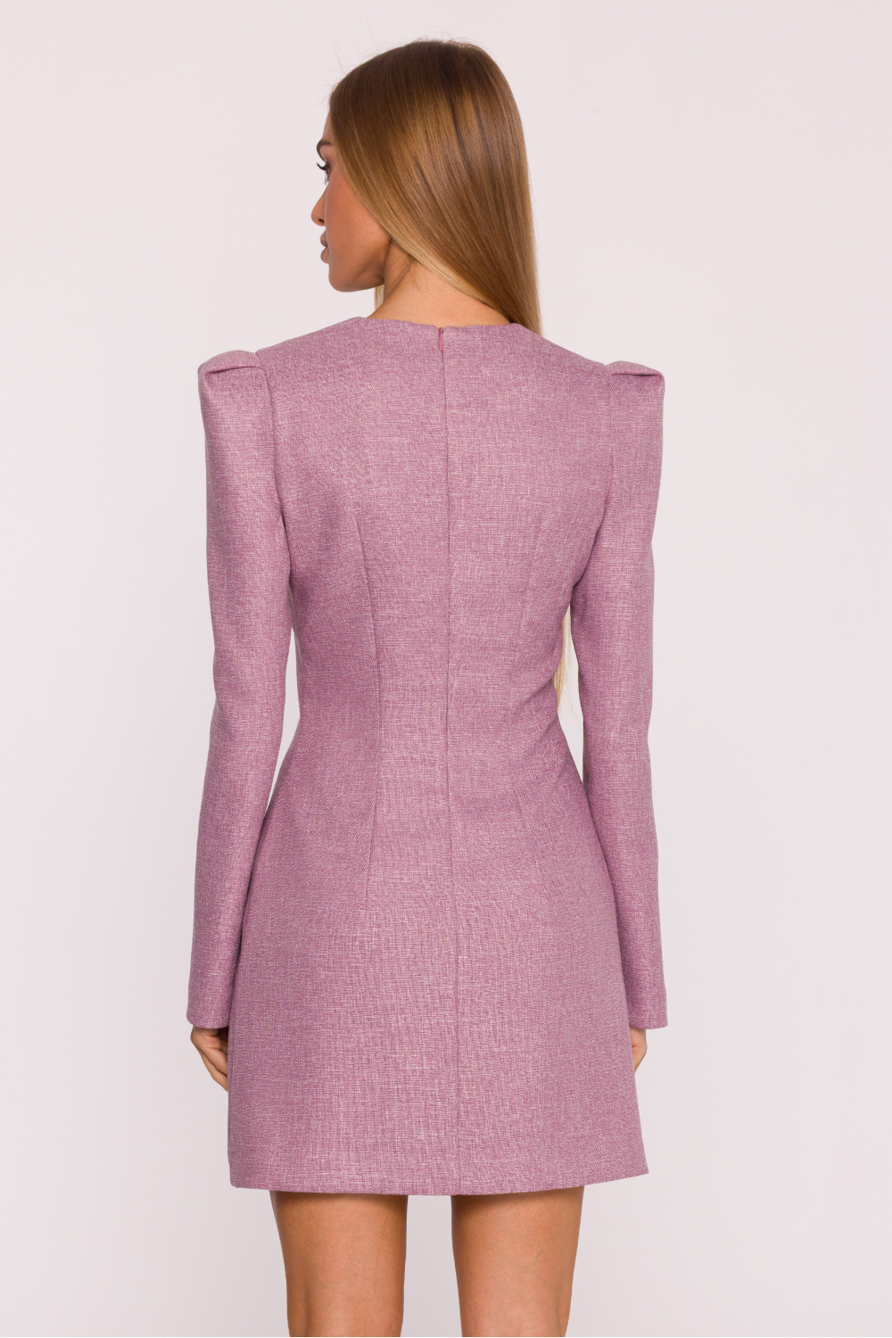 La robe exceptionnelle en tweed mélangé est une élégante proposition avec une touche de modernité. Le matériau structuré se pose magnifiquement sur la silhouette, ajoutant une touche de chic et de classe à l’ensemble. Le modèle a un profond décolleté en forme de V, qui souligne subtilement la silhouette féminine. Les manches longues avec des épaules légèrement élargies et des manches bouffantes donnent à la robe de la netteté et lui confèrent un caractère à la mode et structuré. La fermeture à glissière cachée à l’arrière assure confort et finition esthétique. Le détail exceptionnel est la broche décorative, un nœud en mousseline avec un pendentif en bijoux, qui ajoute une touche élégante et bijoutée à la robe et la rend encore plus exceptionnelle. La coupe légèrement ajustée avec une taille plus marquée souligne les proportions de la silhouette, et la longueur mini ajoute de la légèreté et du charme féminin à l’ensemble. Conçue et fabriquée en Pologne, parfaite pour les femmes qui apprécient la classique avec des détails modernes et décoratifs.