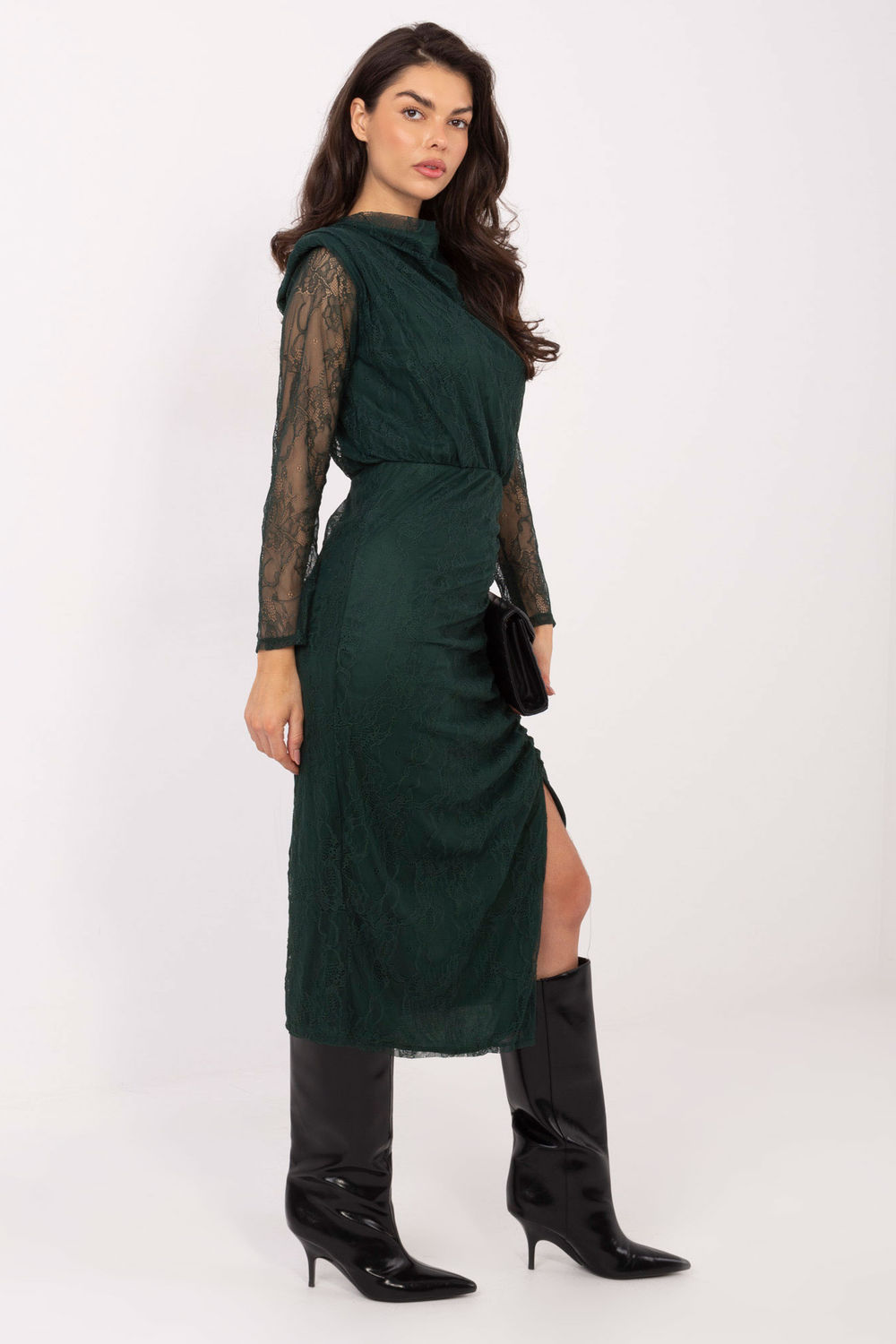 La robe en dentelle élégante de caractère classique et très féminin, idéale pour les occasions spéciales. La coupe crayon met magnifiquement en valeur la silhouette, et la ceinture élastique assure un confort de port et un ajustement parfait à la silhouette. Le modèle est fabriqué en viscose de haute qualité avec une touche d’élasthanne, ce qui rend le tissu doux, élastique et confortable à porter. La texture variée du tissu et la dentelle confèrent à la robe un aspect élégant et luxueux. La longueur midi associée à une manche longue donne à l’ensemble un look incroyablement stylé et intemporel. Le décolleté fluide et élégant ajoute de la légèreté et de la subtilité sensuelle, tandis que les plis sur le devant en bas avec une fente soulignent la silhouette et offrent une liberté de mouvement. La robe n’a pas de fermeture à glissière et s’enfile par la tête. Le modèle est équipé d’épaulettes qui donnent une forme élégante et soulignent la ligne des épaules, ainsi que d’une doublure, à l’exception des manches, ce qui améliore le confort et l’esthétique de la finition. C’est un excellent choix pour les cérémonies, les réunions officielles et les sorties exceptionnelles.