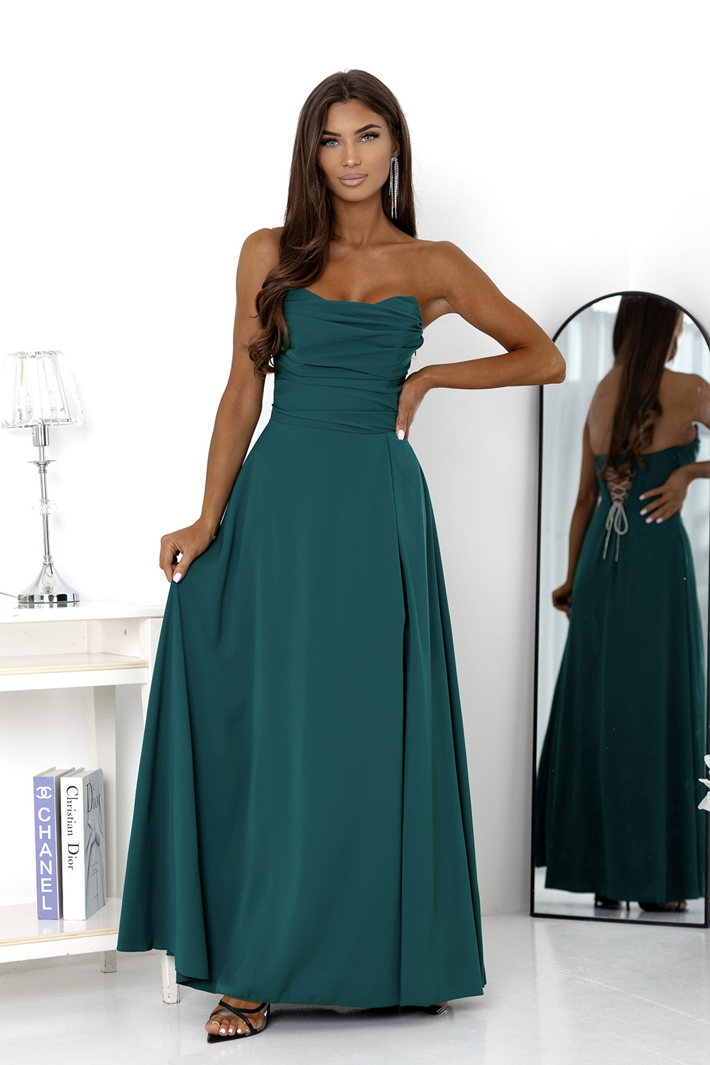 Une longue robe en tissu lisse et brillant. Modèle avec bretelles amovibles, haut légèrement froncé et une fente haute et spectaculaire sur la jambe. Le dos est fini par un laçage corset ajustable qui épouse parfaitement la silhouette, avec une fermeture éclair supplémentaire sur le côté. La jupe évasée se pose magnifiquement en mouvement, créant un effet léger et élégant. Parfait pour les bals de fin d’année, le réveillon du nouvel an et autres occasions spéciales.