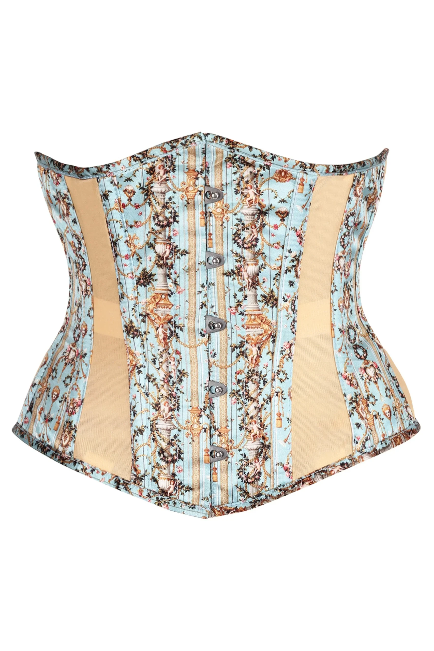 This corset features an opulent, vintage-inspired design with a romantic and ornate aesthetic. The base fabric is a soft, powder blue adorned with an intricate print of floral garlands, classical urns, and scrollwork in warm shades of gold, cream, and brown, evoking the grandeur of Rococo decor. Structured with vertical boning for a sculpted silhouette, the corset combines the printed panels with contrasting solid beige inserts at the sides, enhancing the hourglass shape.