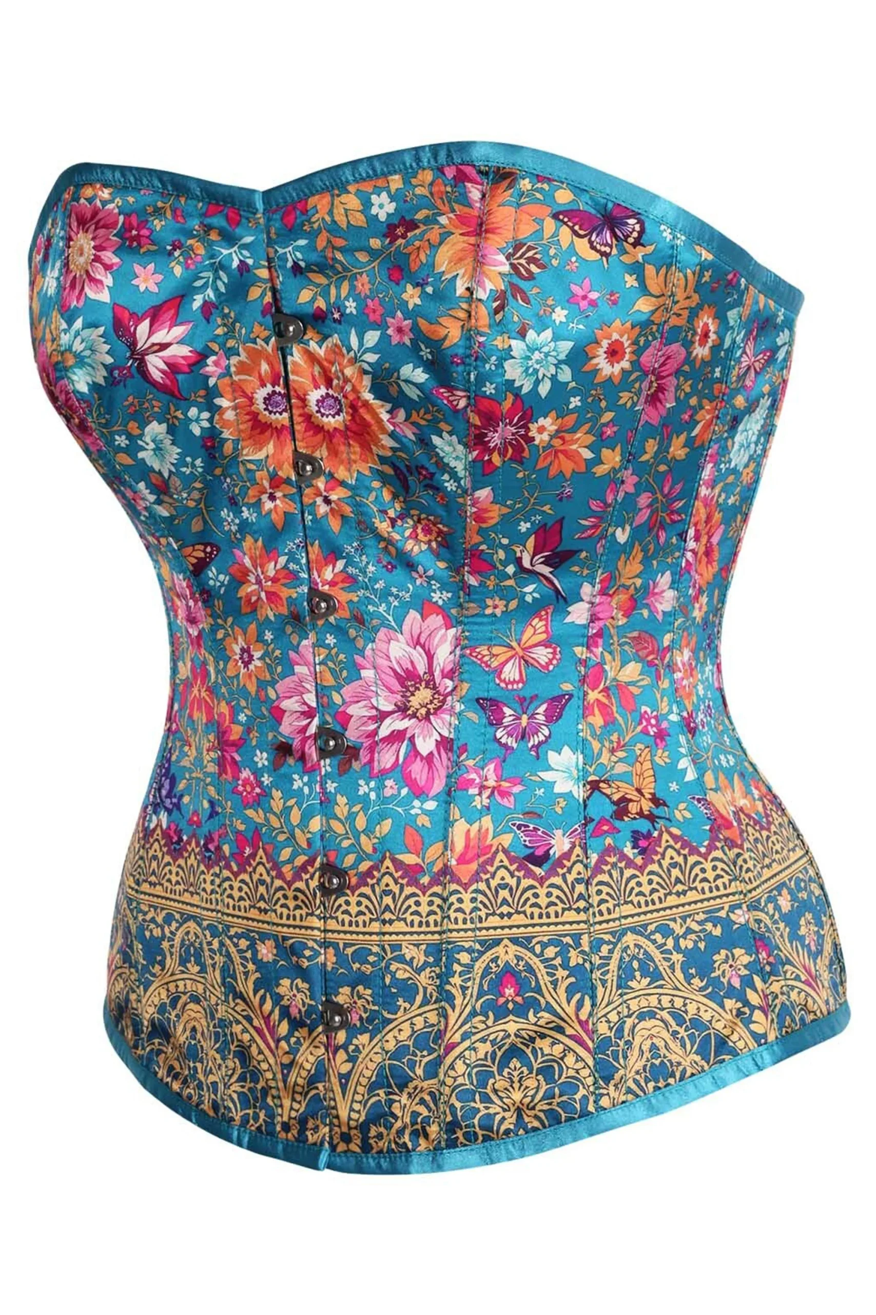 This stunning corset is a vibrant and romantic statement piece, showcasing a richly detailed floral and butterfly pattern against a vivid teal background. The design features an array of blooming flowers in shades of fuchsia, orange, pink, and white, interwoven with delicate leafy vines and fluttering butterflies, evoking the lushness of a botanical garden in full bloom.