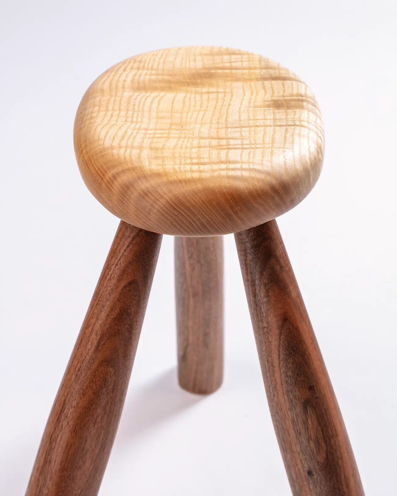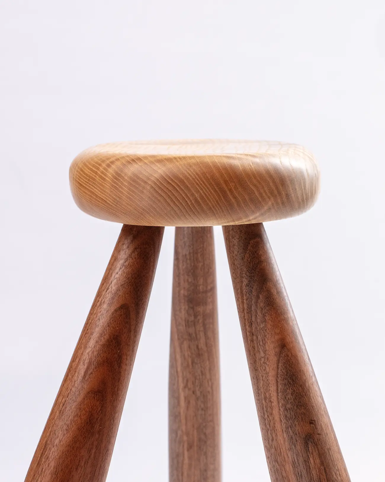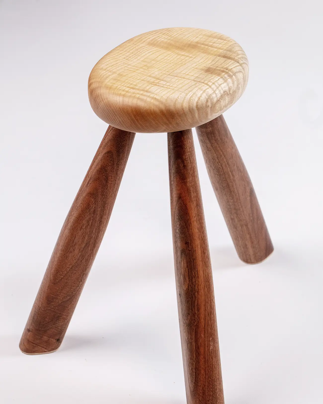 Avec une silhouette aérienne, il s’élance avec grâce sur des pieds fins en noyer. Son assise ovale en frêne ondé, aux reflets changeants, apporte du contraste, de l’expression et de l’équilibre à cette pièce.