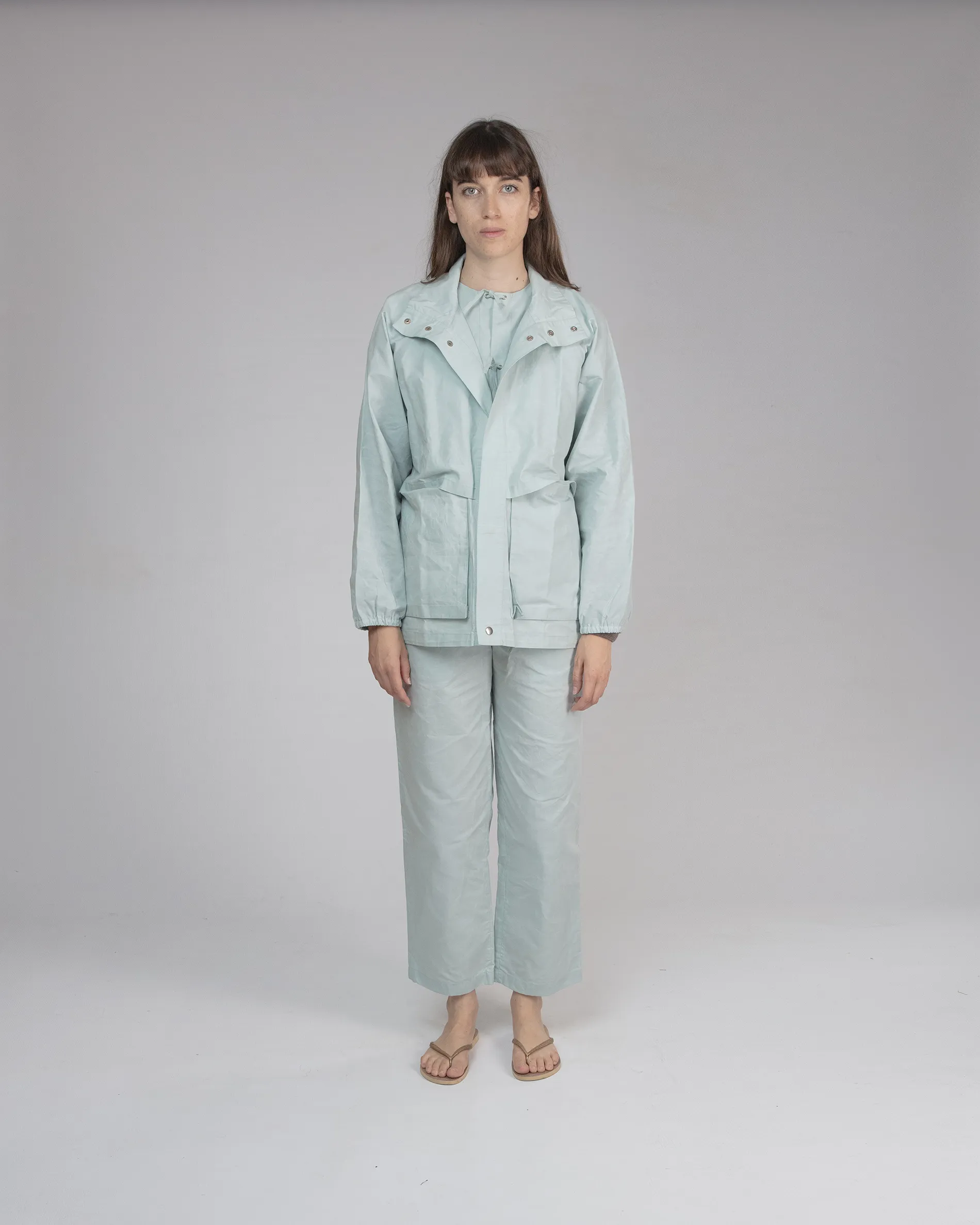 La Veste à rabat légère introduit le nouveau vestiaire utilitaire et naturel de Maison Douillet. Réalisée dans un coton enduit sec, à la texture marquante et structurée, c’est une pièce légère, inter-saison, qui associe minimalisme et construction utilitaire.