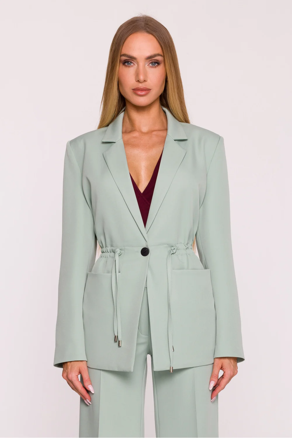 La veste de tailleur élégante pour femme, fabriquée dans un tissu lisse à la finition mate, allie classicisme et fonctionnalité moderne. La coupe oversize décontractée offre une grande liberté de mouvement, tandis que la taille ajustable avec des cordons métalliques permet d’adapter la veste à la silhouette, mettant en valeur la taille féminine. Le modèle est doté d’un col classique avec revers et d’une fermeture à un bouton, qui, combinée aux cordons, crée une finition élégante et moderne à la fois. Les manches longues sans poignets et les grandes poches plaquées ajoutent de la praticité et un caractère subtil et décontracté. La veste est entièrement doublée, garantissant un confort de port et un ajustement parfait du tissu. La coupe droite, avec possibilité de réglage à la taille, fait que la veste se marie parfaitement aussi bien avec des tenues élégantes que décontractées. Conçue et fabriquée en Pologne, elle est destinée aux femmes qui apprécient le confort, le style et les détails modernes dans une version classique.