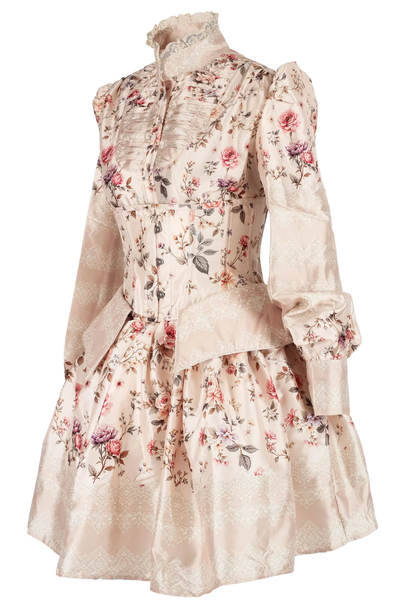 The high-collared blouse features gathered puff sleeves, a pleated bib front, and lace trim at the collar and cuffs, evoking a refined Victorian silhouette. The underbust corset cinches the waist with functional lacing at the back and decorative front buttons, sculpting a flattering hourglass shape while showcasing the floral motifs. Completing the look, the voluminous skirt flares outward with generous pleating, punctuated by angular overskirt panels for added drama and dimension.