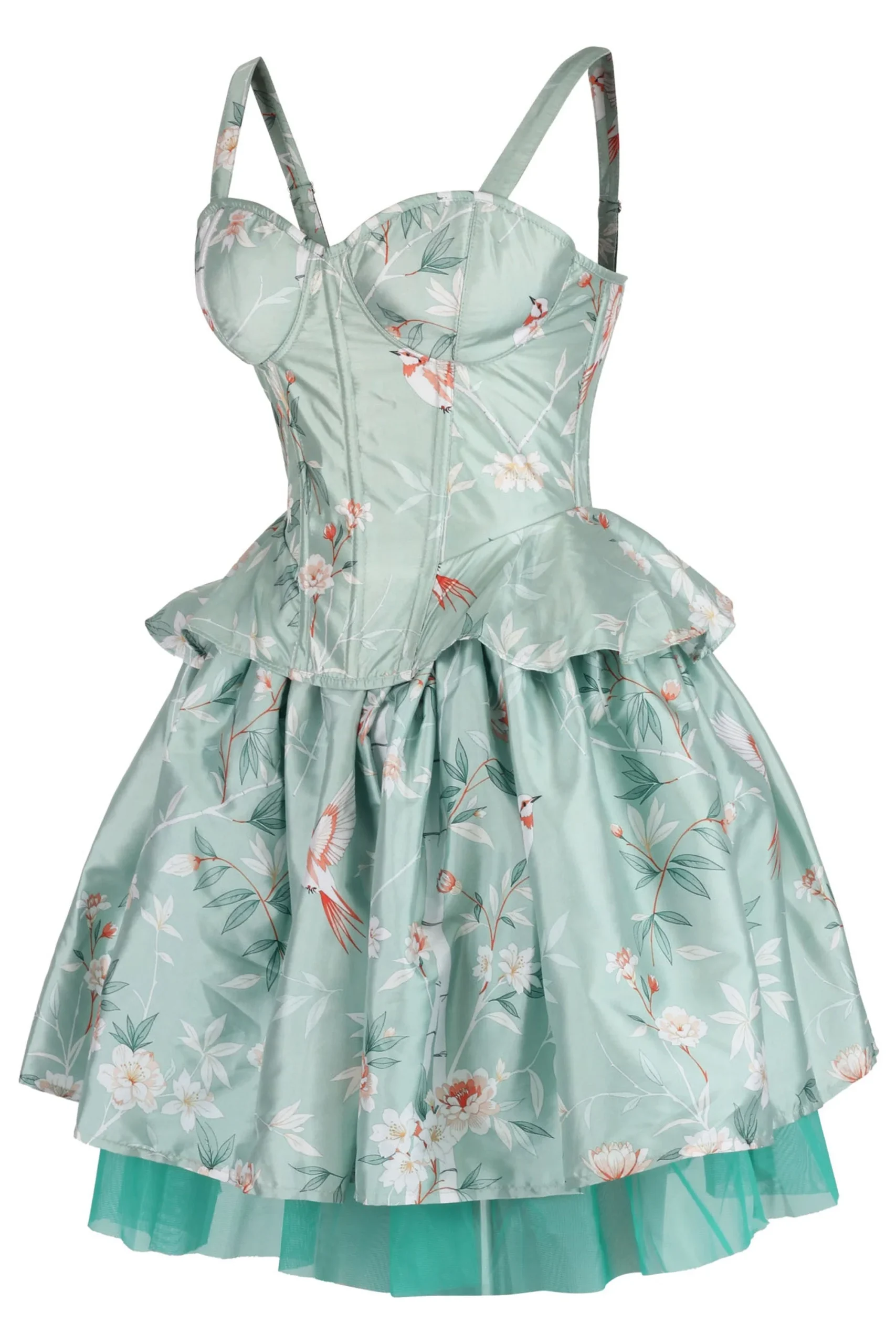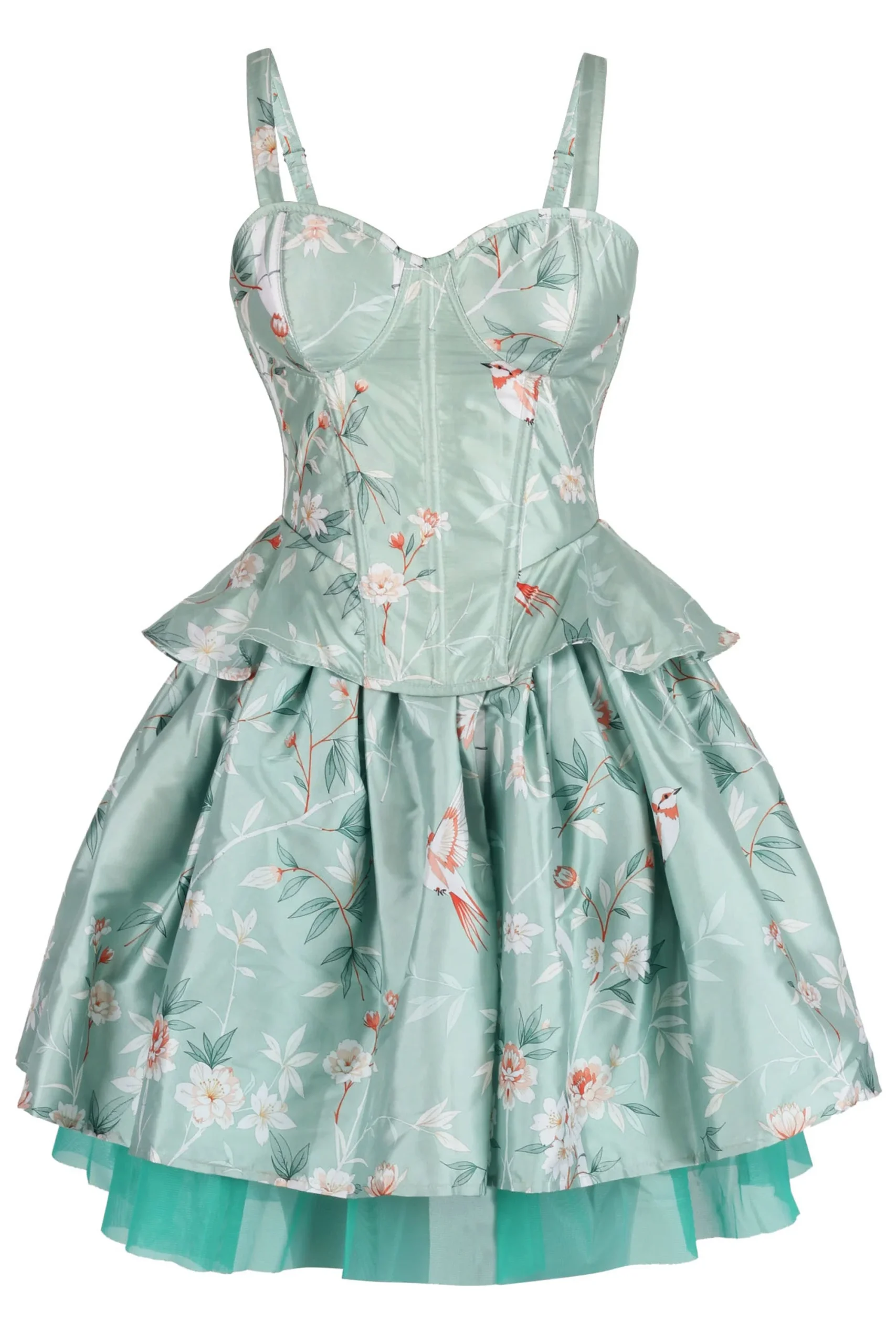 Step into romantic elegance with this enchanting two-piece corset and skirt set, crafted from glossy mint green satin adorned with a delicate bird and floral print. The structured overbust corset features boning for shape and support, a sweetheart neckline, and a soft peplum flare at the waist for a vintage-inspired silhouette. Adjustable shoulder straps and a lace-up back ensure a customized, flattering fit.