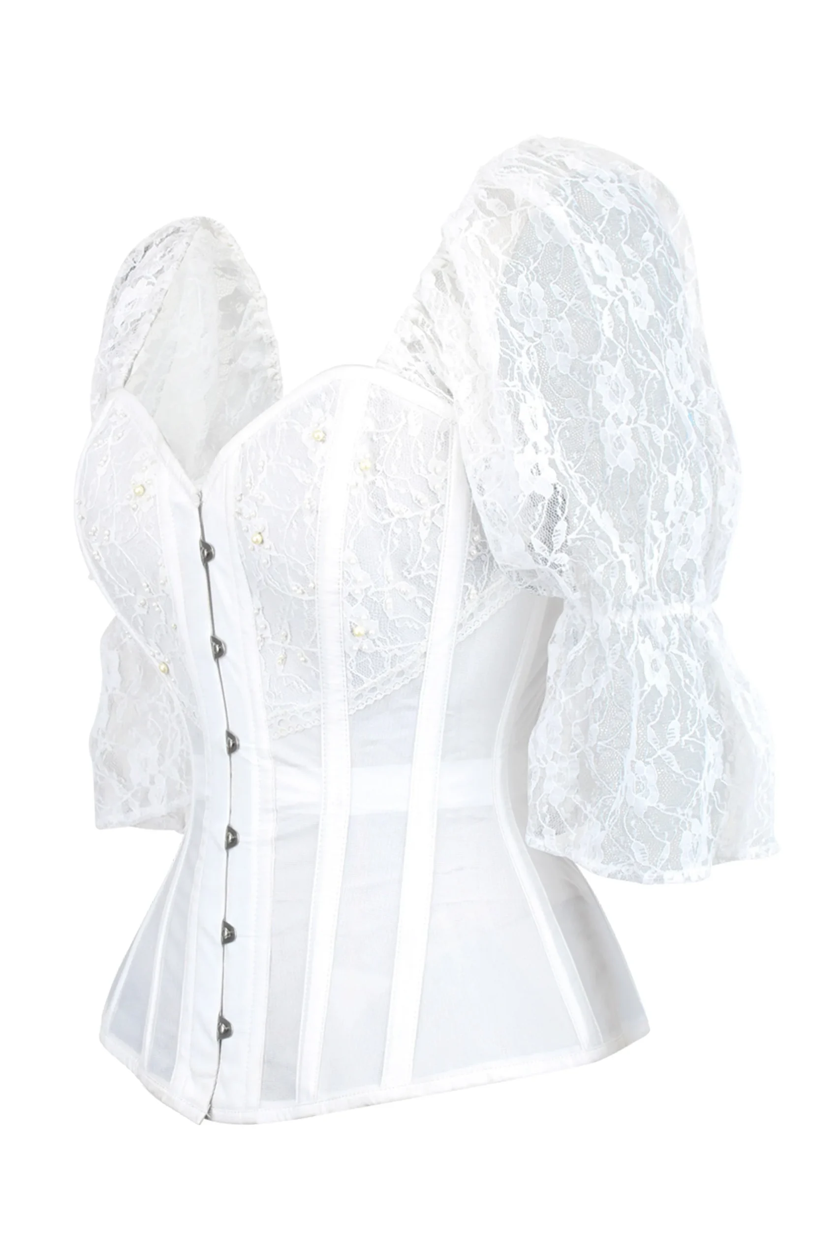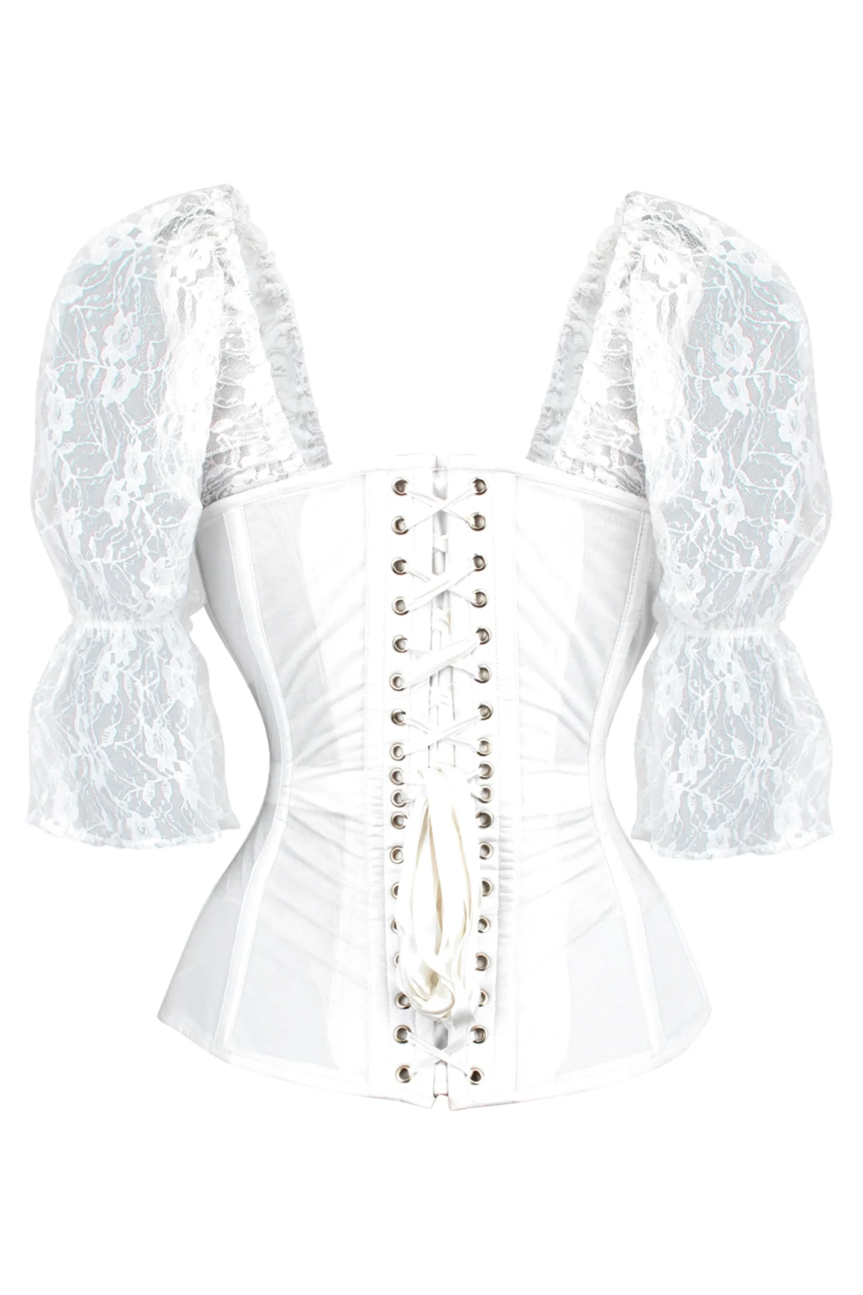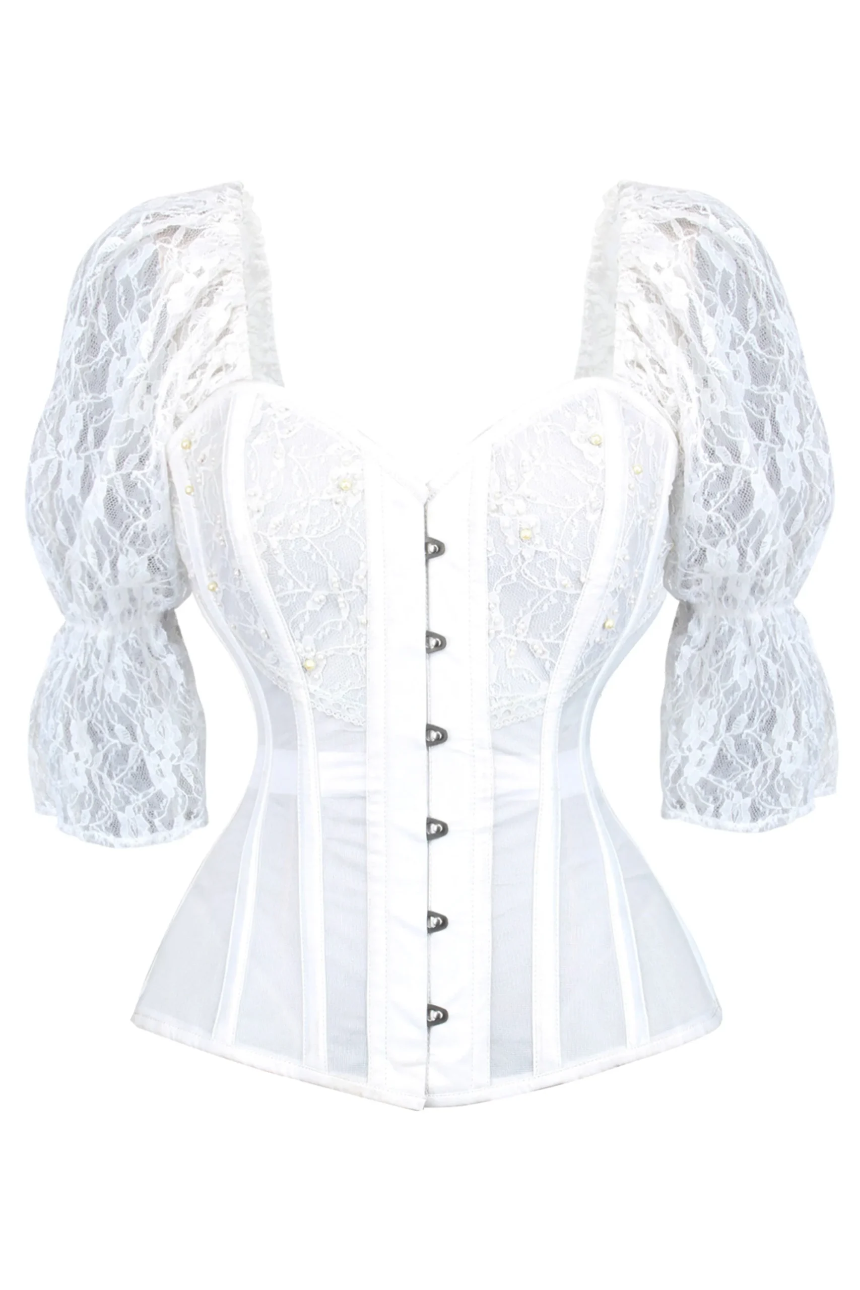 Elevate your bridal look with our White Mesh Overbust Corset. The delicate lace sleeves exude romance, while the breathable mesh fabric offers comfort and support. Perfect for any wedding dress, this corset enhances your silhouette and adds a touch of elegance to your special day.